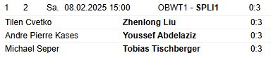 Sowohl Tilen Cvetko (0:3 gegen Zhenlong Liu), als auch Andre Pierre Kases (0:3 gegen Youssef Abdelaziz) und Michael Seper (0:3 gegen Tobias Tischberger) hatten ihren Gegnern nichts entgegenzusetzen. So schied man in der Runde der letzten 16 Mannschaften aus.