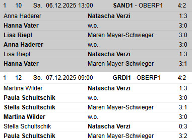In den Runden 10 und 12 der 2. Damenbundesliga konnte OBERP1 krankheitsbedingt nur zu zweit antreten und kassierte Niederlagen. Sandl und Großdietmanns blieben gegen die Oberpullendorferinnen jeweils 4:2 siegreich.
