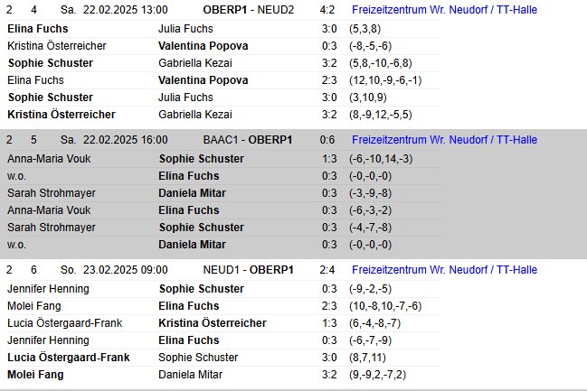 Am Sonntag ging es gegen Wr. Neudorf 1, kein leichtes Unterfangen, doch Elina Fuchs (3:2 gegen Molei Fang und 3:0 gegen Jennifer Henning), Sophie Schuster (3:0 gegen Jennifer Henning und 0:3 gegen Lucia Östergaard-Frank), Kristina Österreicher (3:1 gegen Lucia Östergaard-Frank) und Daniela Mitar (2:3 gegen Molie Fang) setzten mit dem 4:2-Sieg ein weiteres Ausrufezeichen.