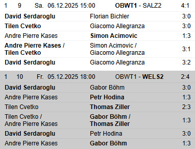 Weitaus besser lief es im Samstagspiel gegen Salzburg 2: David Serdaroglu besiegte Florian Bichler genauso wie Giacomo Allegranza, Tilen Cvetko gewann gegen Giacomo Allegranza und das Doppel Kases/Cvetko blieb gegen Acimovic/Allegranza ungeschlagen. Das ergab einen deutlichen 4:1-Sieg.