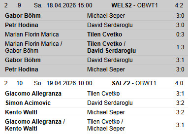 Wels konnte erstmas im Frühjahr wieder ihren Topspieler Petr Hodina einsetzen und dieser war an diesem Tag unglaublich motiviert und gewann seine beiden Einzelspiele glatt mit 3:0. Tilen Cvetko gewann sein erstes Einzelspiel ebenfalls 3:0 und das Doppel gemeinsam mit David Serdaroglu 3:1 und sorgte kurzfristig für den Ausgleich zum 2:2. Doch danach konnte der UTTC Oberwart leider nicht mehr mithalten. Wels war an diesem Tag eindeutig die bessere Mannschaft und gewann em Ende verdient mit 4:2.