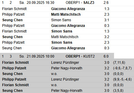 Sehr stark präsentierte sich der erstmals eingesetzte Nachwuchsspieler Seung Chen seitens Oberpullendorf, der die beiden Ehrenpunkte holte und einen gelungenen Einstand feierte. Philipp Patzelt verlor leider zwei Spiele ganz knapp im 5. Satz, bei etwas mehr Glück wäre die Partie sicherlich noch spannend geworden. Florian Schmidt musste seine beiden Partien abgeben, somit war die 2:6-Niederlage besiegelt.
