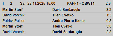 Diesmal kam wieder David Serdaroglu zum Einsatz, was sich zu Beginn leider nicht wirklich auswirkte. Er verlor gegen Martin Storf im 5. Satz. Doch mit 2 Siegen von Tilen Cvetko (3:1 gegen David Vorcnik) und Andre Pierre Kases (3:0 gegen Patrick Peitler) ging man mit 2:1 in Führung.