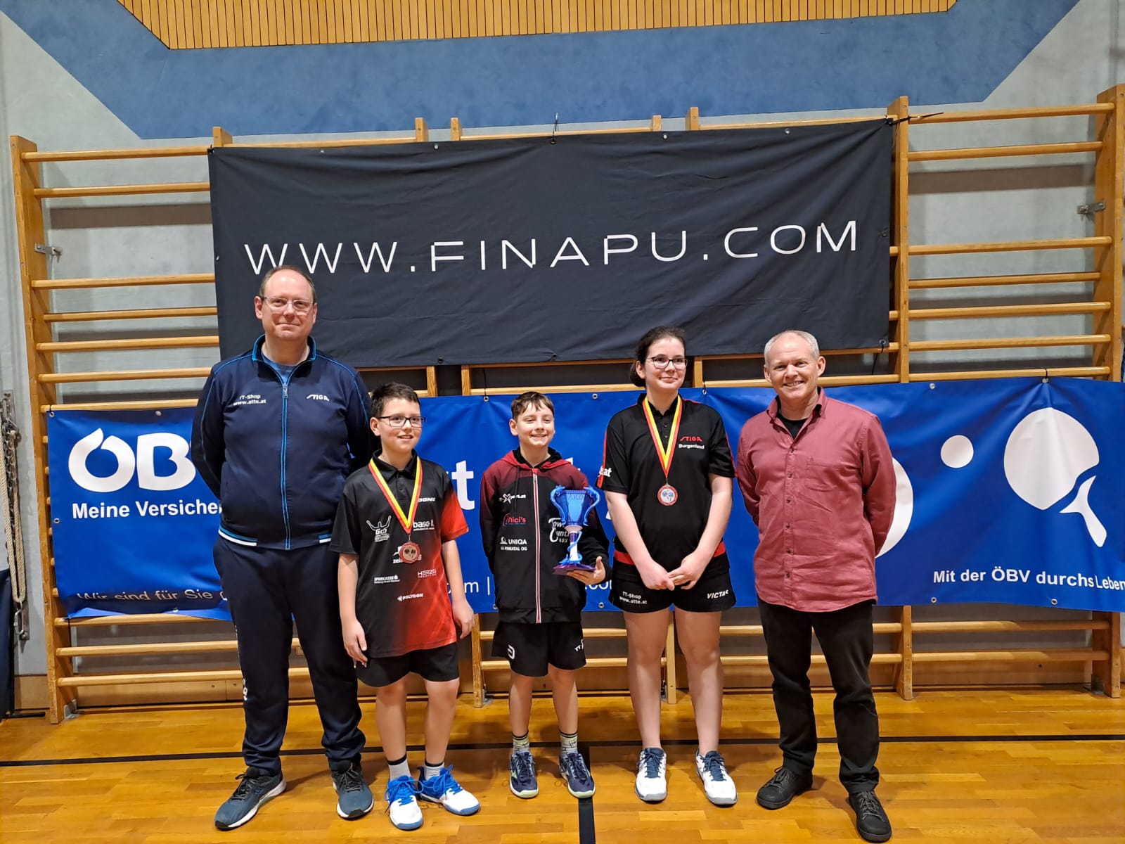 Die Sieger im Bewerb U13: Lorenz Fuhrmann, Kilian Ruck und Luzia Regner, links Sportreferent Balázs Molnár, rechts Obmann Robert Lahr