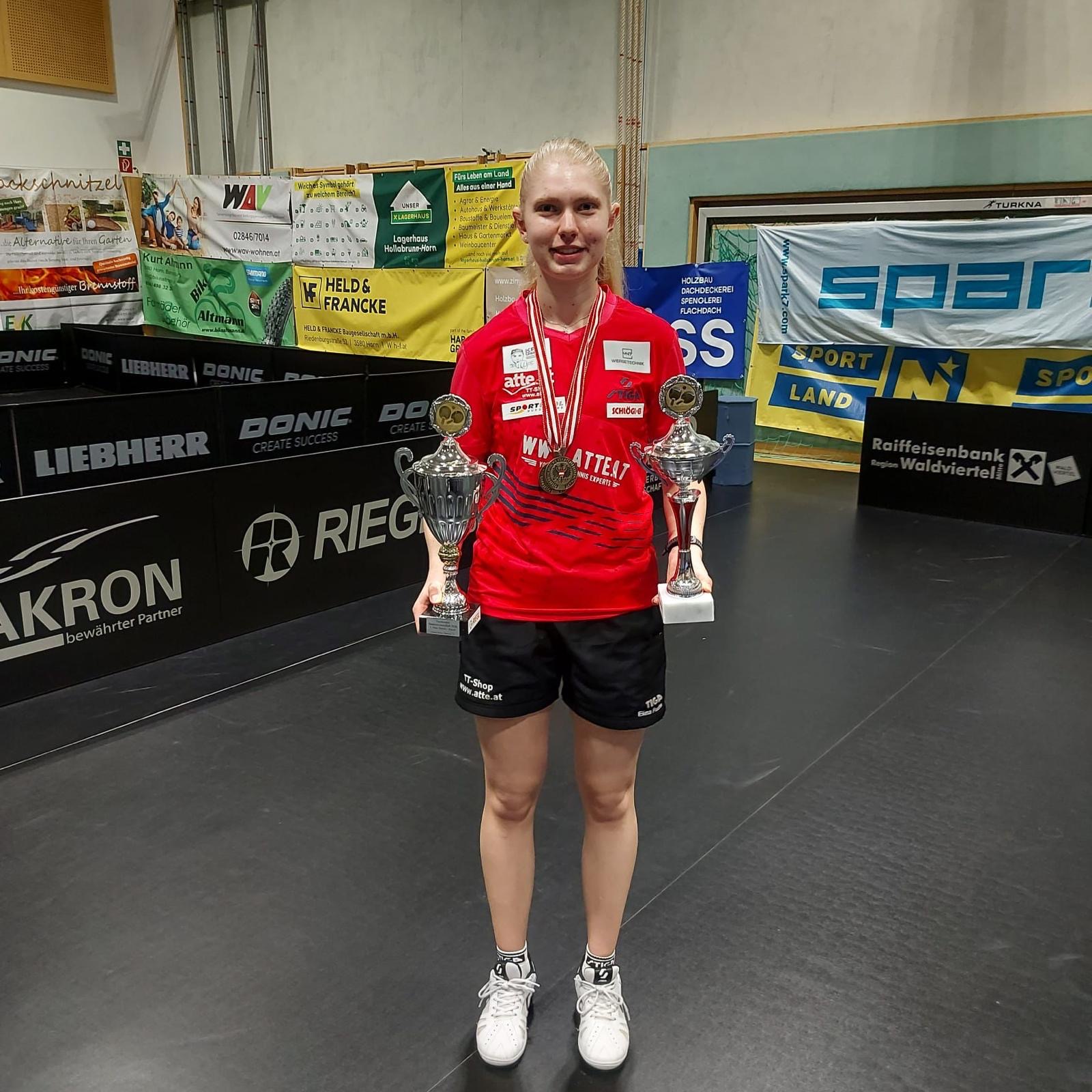 Die Burgenländerin gewann mit ihrer niederösterreichischen Partnerin Nina Skerbinz Bronze im Damen-Doppel. Die beiden mussten sich im Halbfinale nach einem knappen Spiel gegen die Paarung Mischek/Galitschitsch (NÖTTV) im 5. Satz geschlagen geben. Mischek/Galitschitsch konnten dann das Finale gegen Dür/Lytvyn (STTV/STTTV) überlegen mit 3:0 für sich entscheiden.